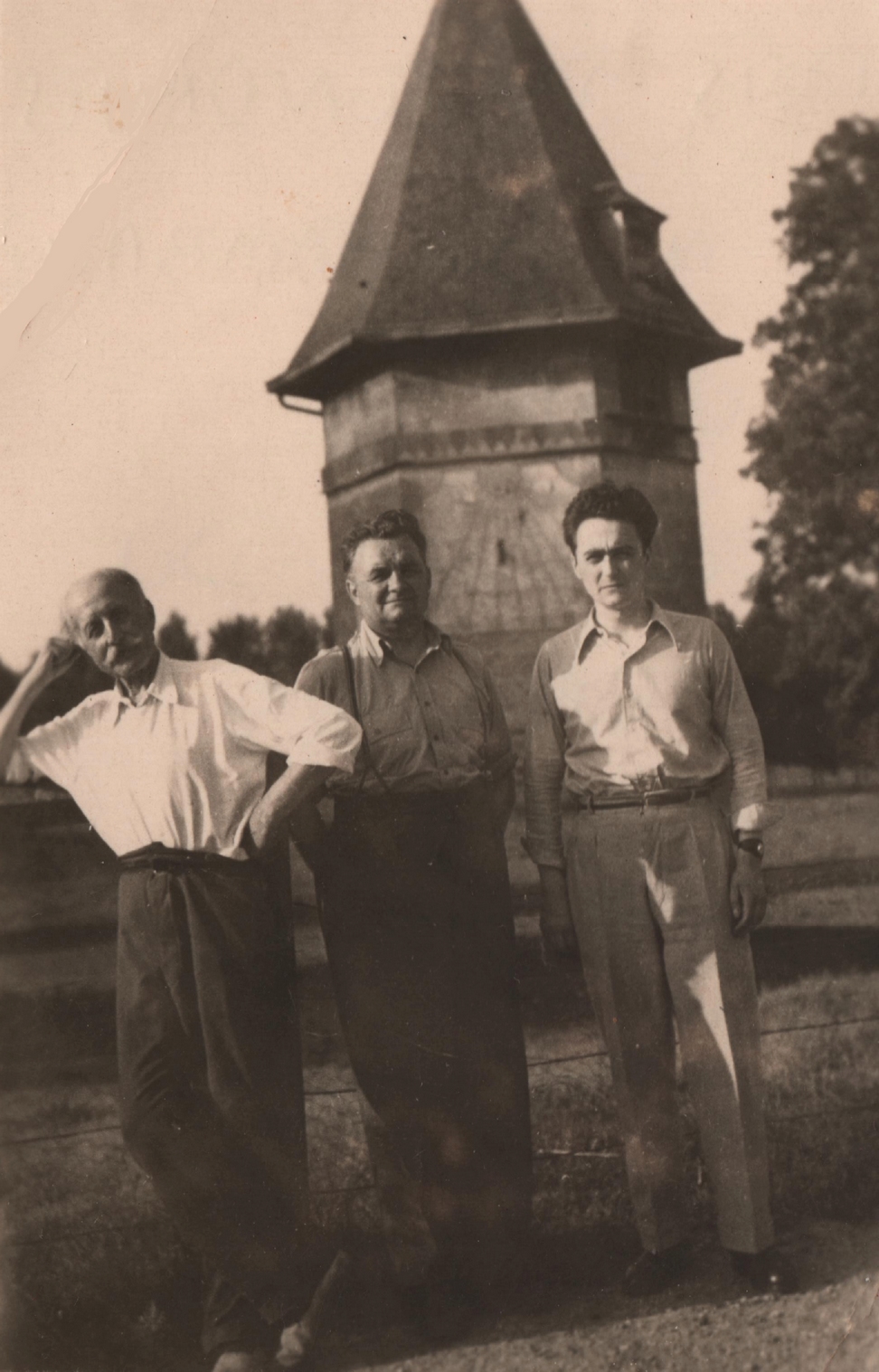 Jean, Gérard et Édouard de Rambaud (trois générations devant le colombier du château de mon grand-père à Jouaignes.